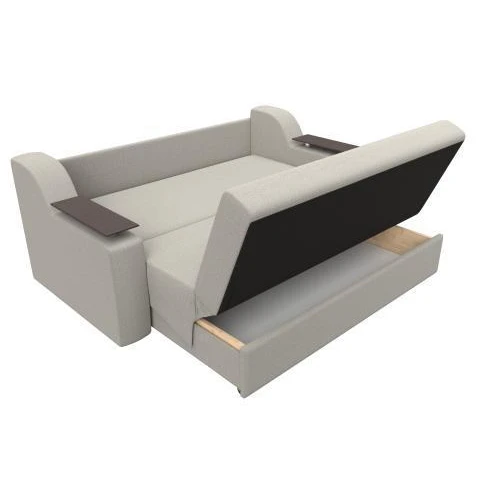 Сенатор – элегантный прямой диван аккордеон с ящиком для хранения белья. Изделие с легкостью раскладывается в комфортабельную двуспальную кровать. Подлокотники дополнены деревянными столешницами, выполняющими функцию мини-столиков.