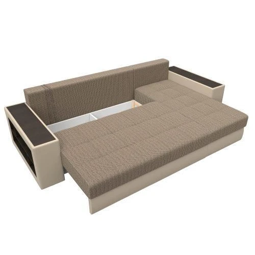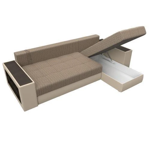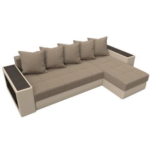 Компактный угловой диван Дубай универсален в использовании. Верх подлокотников – деревянные мини-столики. Сбоку имеются глубокие полочки для хранения предметов декора. Спинка состоит из 5 мягких подушек под цвет обивки. Под угловым и основным сидениями изделия располагаются вместительные ящики для белья.
