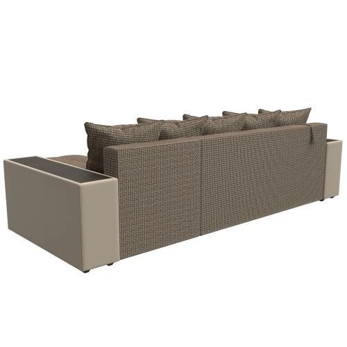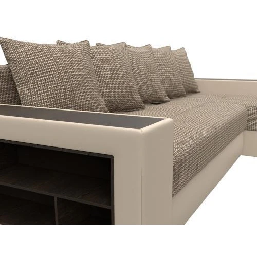 Компактный угловой диван Дубай универсален в использовании. Верх подлокотников – деревянные мини-столики. Сбоку имеются глубокие полочки для хранения предметов декора. Спинка состоит из 5 мягких подушек под цвет обивки.
