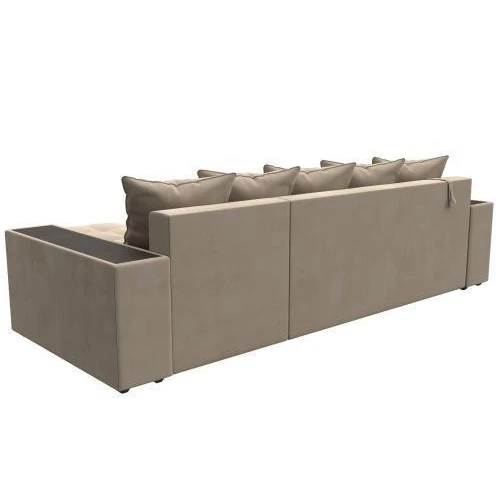 Компактный угловой диван Дубай универсален в использовании. Верх подлокотников – деревянные мини-столики. Сбоку имеются глубокие полочки для хранения предметов декора. Спинка состоит из 5 мягких подушек под цвет обивки.