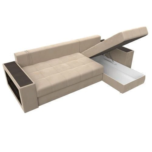 Компактный угловой диван Дубай универсален в использовании. Верх подлокотников – деревянные мини-столики. Сбоку имеются глубокие полочки для хранения предметов декора. Спинка состоит из 5 мягких подушек под цвет обивки. Под угловым и основным сидениями изделия располагаются вместительные ящики для белья.